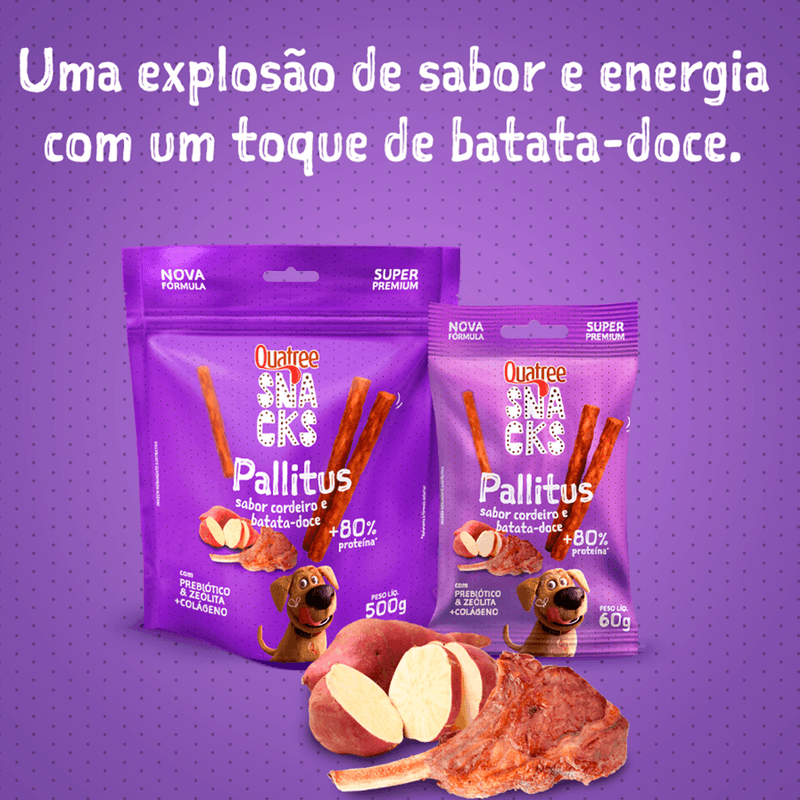 Pallitus Sem corantes, sem aromas artificiais e 100% livre de transgênicos, a linha Quatree Snacks Pallitus tem formato especial de palitinhos. O snack que faz a alegria do seu cão.